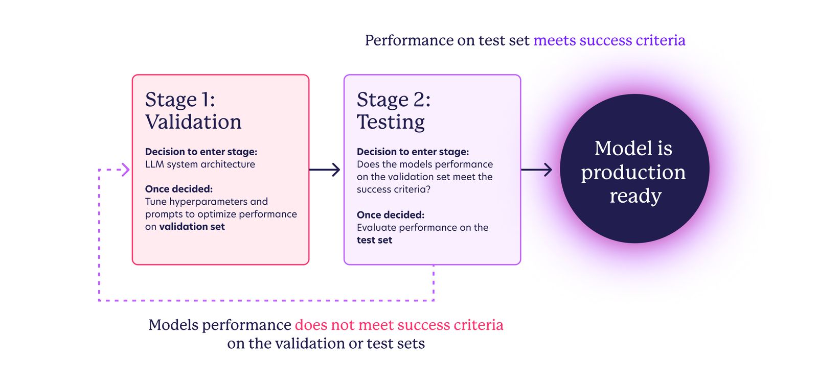 Since we are using GPT-4o, a pre-trained state-of-the-art generalist LLM, we could skip the initial training stage and the need for a training set, focusing instead on curating validation and test sets. The model development flow is adapted to: